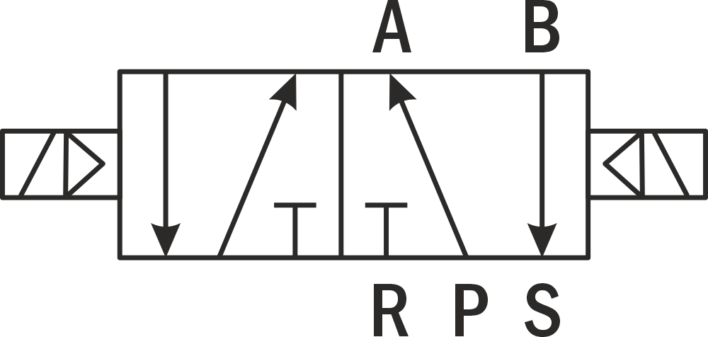 Бистабильный: при подаче питания на первую катушку воздух подается через порт питания P на рабочий порт А, при этом рабочий порт В соединен с портом выхлопа S. При снятии питания золотник остается в том же положении. При подаче питания на вторую катушку порт питания Р переключается на рабочий порт В, а рабочий порт А соединяется с портом выхлопа R. При снятии питания золотник остается в том же положении.