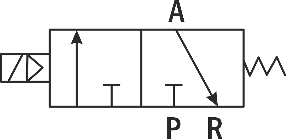 В исходном положении порт питания P перекрыт, рабочий порт А соединен с портом выхлопа R. При подаче питания на катушку порт питания Р соединяется с рабочим портом А, а порт выхлопа R перекрывается. При снятии питания золотник возвращается в исходное положение.