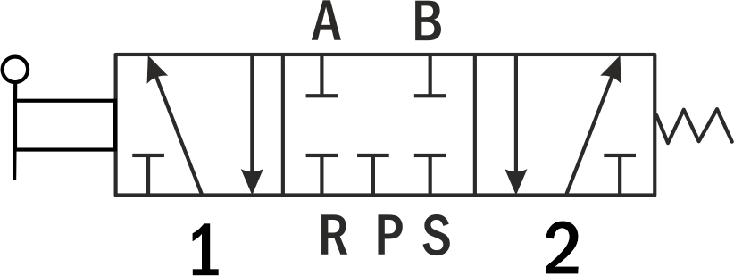 В нейтральном положении все порты закрыты. При переводе рукоятки в положение 1 воздух подается через порт питания P на рабочий порт А, при этом рабочий порт В соединен с портом выхлопа S. При переводе рукоятки в положение 2 порт питания Р переключается на рабочий порт В, а рабочий порт А соединяется с портом выхлопа R.