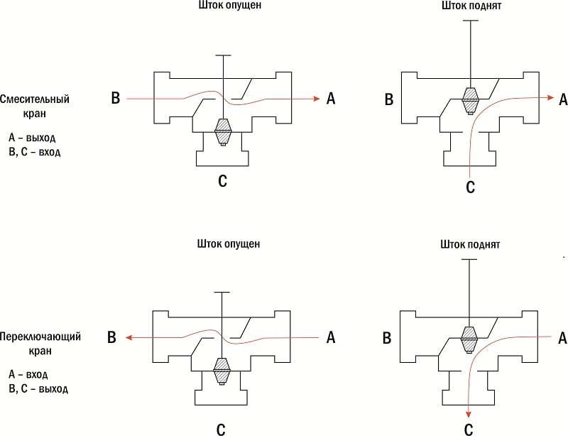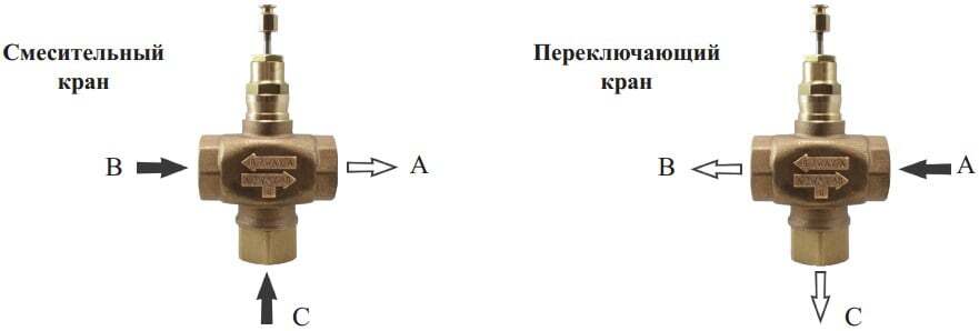 В зависимости от схемы подключения портов кран КЗРЛ-223 может работать как переключающий или как смесительный.