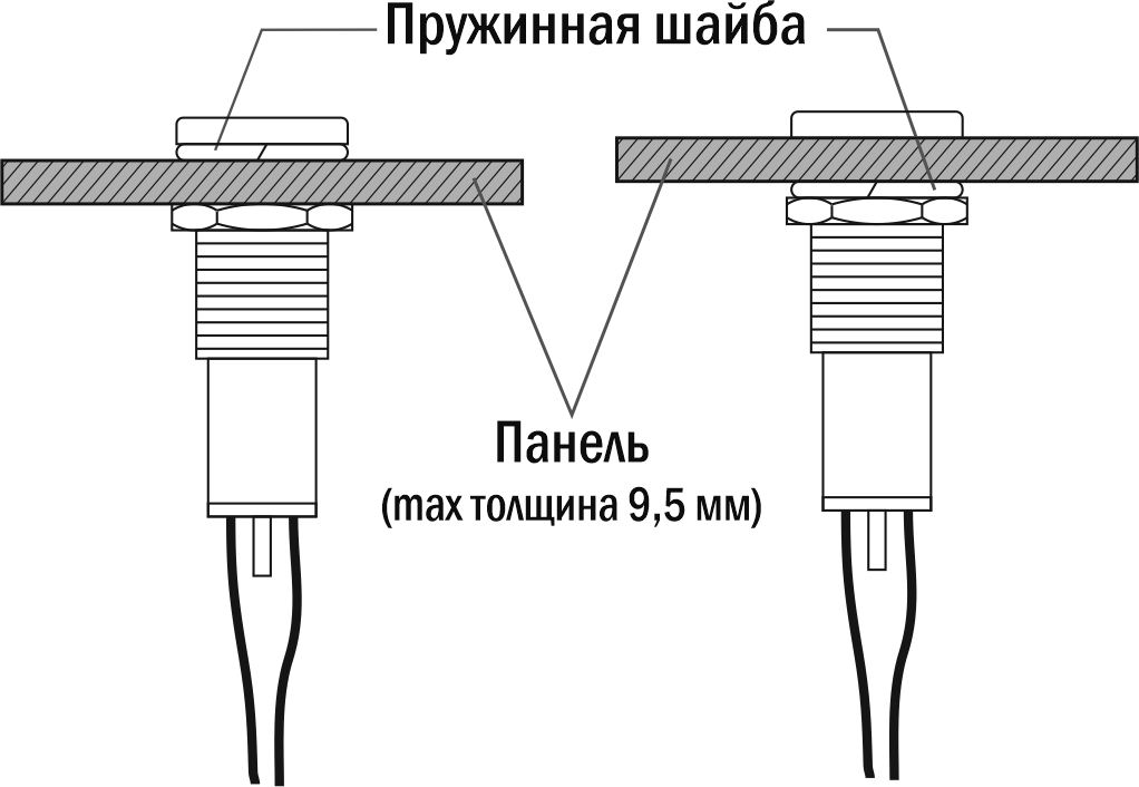 - Монтаж в плоские панели толщиной до 9,7 мм, фиксация стопорной гайкой