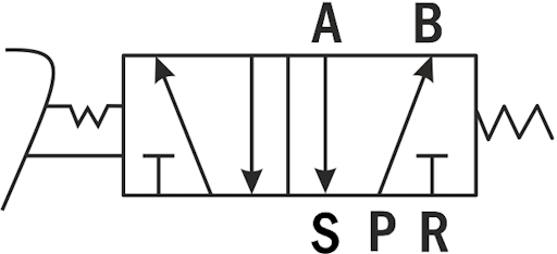 В исходном положении воздух подается через порт питания Р на рабочий порт B, при этом рабочий порт A соединен с портом выхлопа S. При нажатии на педаль порт питания Р переключается на рабочий порт A, а рабочий порт B переключается на порт выхлопа R.