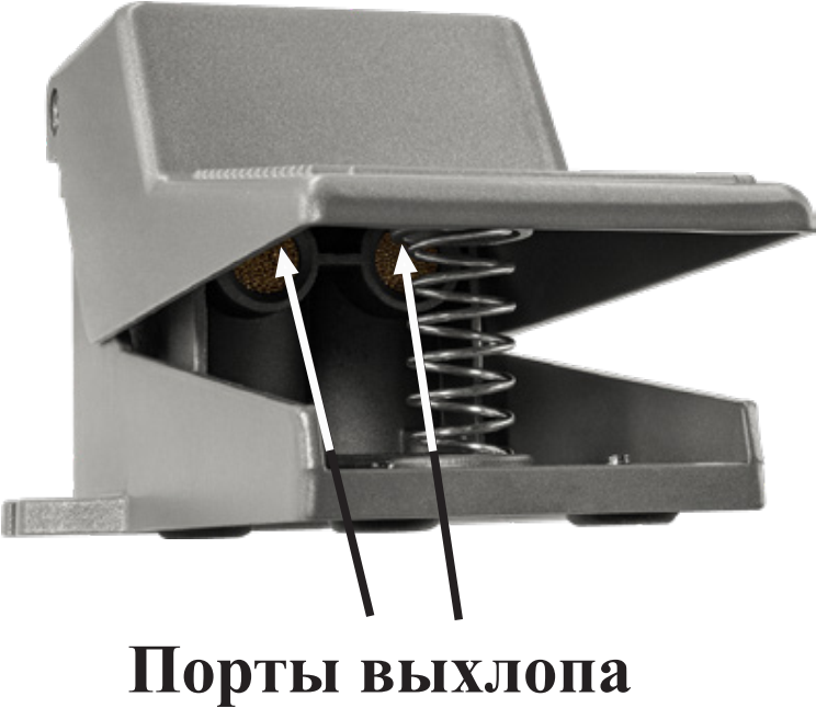 Описание работы:Для управления пневмоцилиндрами двустороннего действия используется пневмопедаль ПП522.У, имеющая возможность коммутировать линии питания, потребителя и выхлопа. Такая пневмопедаль обозначается как 5/2 (5-линейная, 2-позиционная). Это означает, что она имеет 5 каналов ввода-вывода – вход (от источника воздуха), 2 выхода (для подключения рабочего органа) и 2 порта выхлопа (для выброса воздуха при обратном ходе рабочего органа) – и 2 возможных положения золотника. Порты выхлопа оборудованы глушителями и находятся с внутренней стороны педали (см. рисунок).